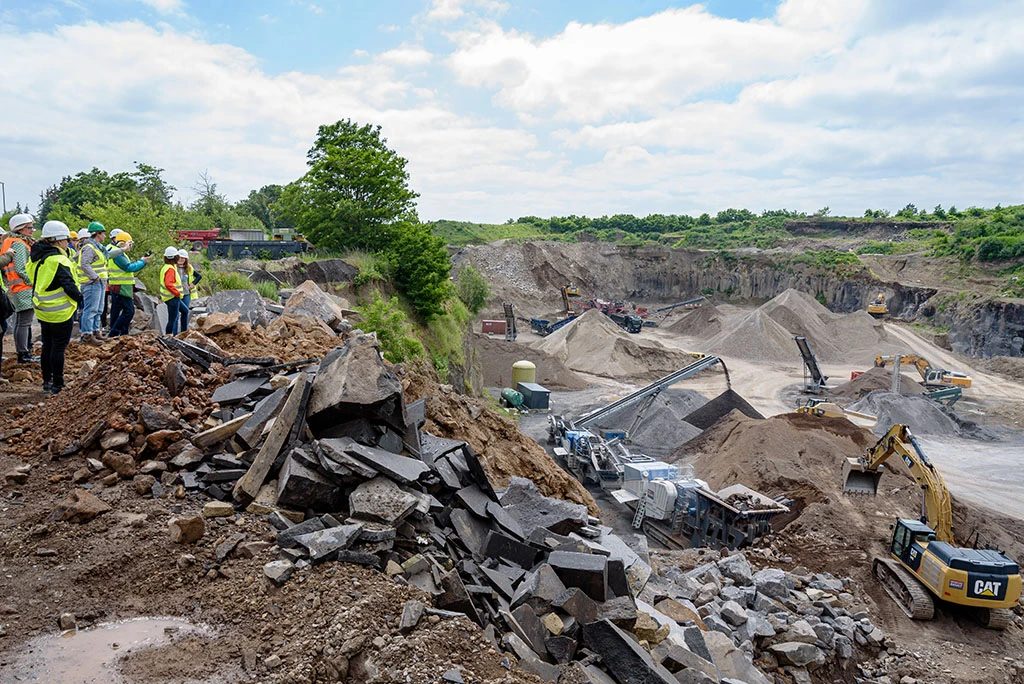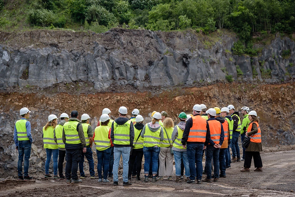 Nach den Vorträgen hatten die Teilnehmer die Wahl zwischen zwei Exkursionen. Die erste führte durch das Kloster Maria Laach und bot Einblicke in normalerweise nicht zugängliche Bereiche. Die Mehrheit der Gäste entschied sich jedoch für die Besichtigung des Mendiger Basaltsteinbruchs. Vor Ort konnten sie die beeindruckenden Basaltformationen sowie die Abbauprozesse und Maschinen besichtigen. Der Rundgang endete mit praktischen Demonstrationen zur Natursteinverlegung. An drei Stationen wurden relevante Arbeitstechniken vorgestellt und gaben wertvolle Hinweise zur richtigen Materialwahl und Ausführung.