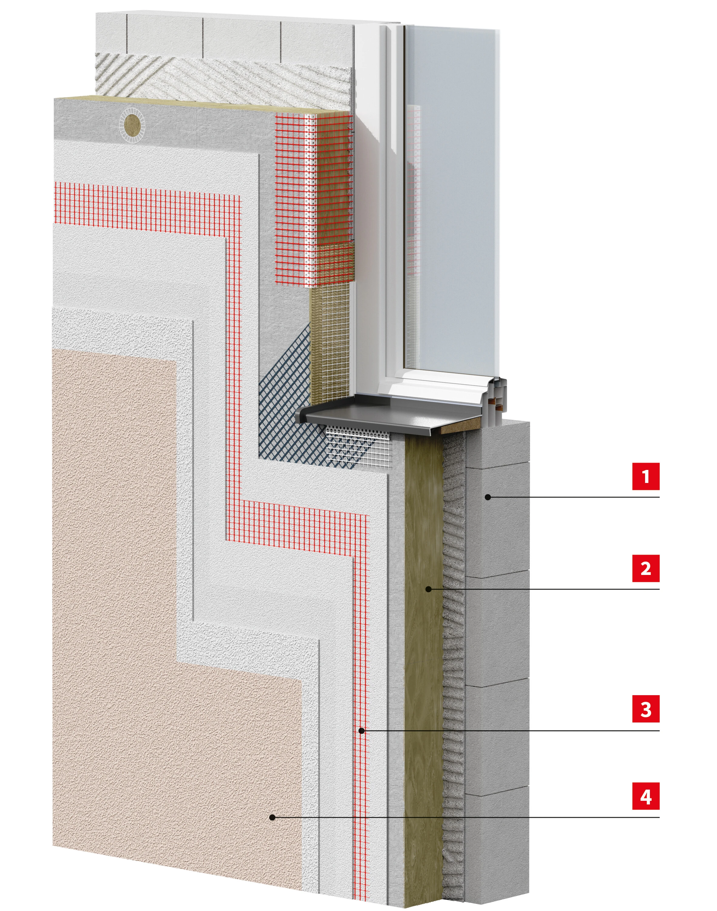 In der zweiten Schicht wird der Dämmstoff mit Klebe- und Armierungsmörtel auf dem Mauerwerk verklebt und mit Dübeln gesichert. Mögliche Dämmmaterialien sind z.B. Mineralwolle, Polystyrol oder Holzfasern. Diese Schicht hält die Wärme im Gebäude.