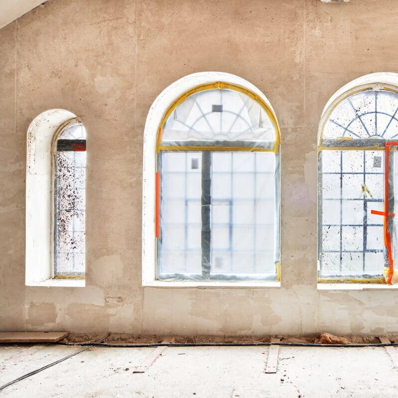 Besonders herausfordernd war die Frage nach der Isolierung: So ließ die erhaltenswerte Fassade keine nachträgliche Dämmung von außen zu – und das unebene Mauerwerk im Inneren erforderte besondere Maßnahmen. Zum Einsatz kam deshalb die akurit Tri-O-Therm L – eine rein mineralische, spritzbare Wärmedämmung, die sich innen wie außen auf Mauerwerk auftragen lässt und dabei selbst größte Unebenheiten ausgleicht. Das macht das Produkt mit seiner Lebensdauer von 40 Jahren ideal für Sanierungsprojekte wie das in Lünen, auch, weil es sich vor allem für architektonische Besonderheiten wie Rundungen, Bögen oder Fenster eignet. Dabei kommt das nachhaltig produzierte Material ohne Kunststoffzuschläge aus und ist – im Falle erneuter Sanierungsmaßnahmen – einfach vom Untergrund trennbar und sortentrein recyclebar, ergo: recycle-ready für die Kreislaufwirtschaft.