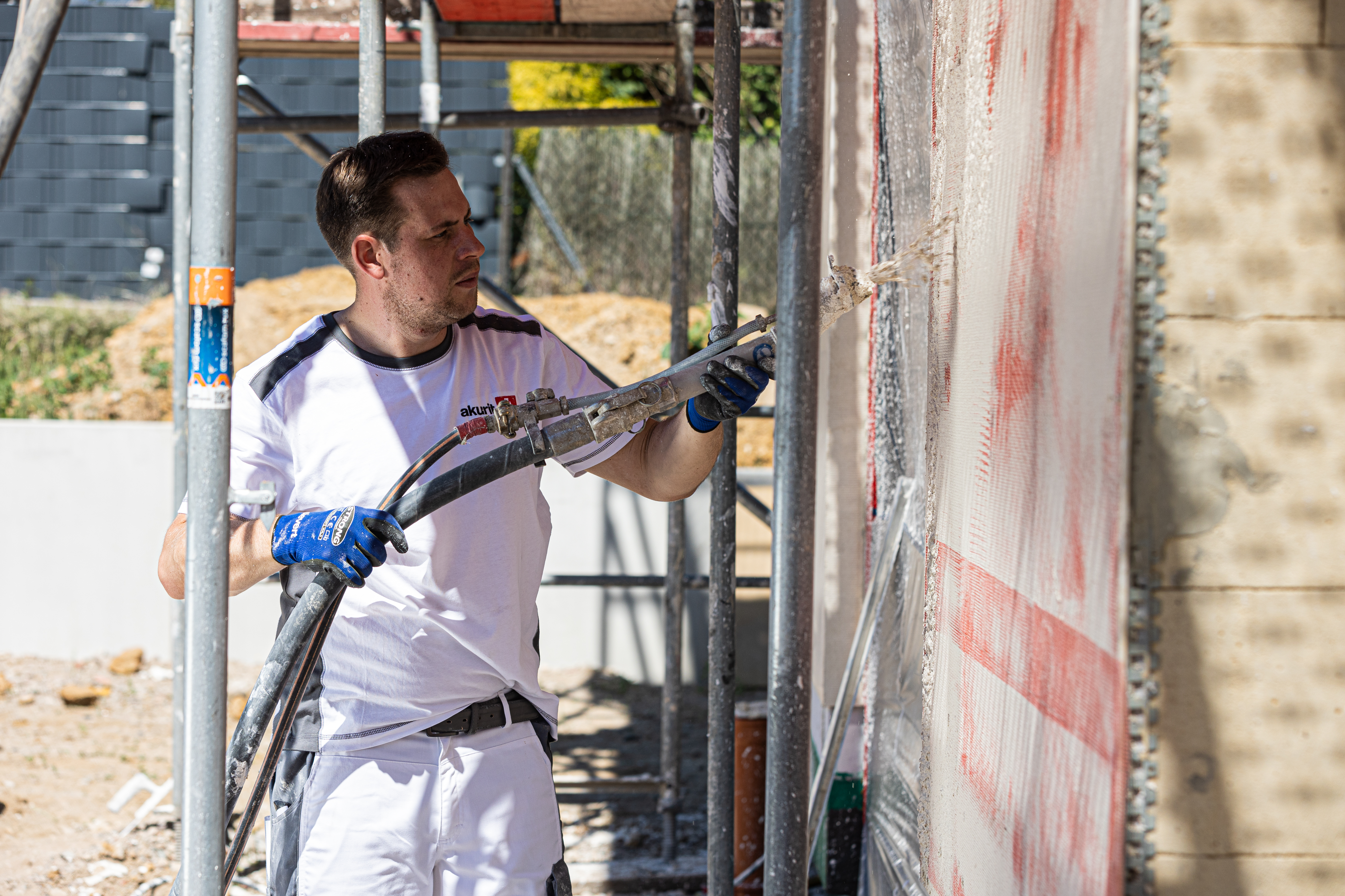 Sind alle Beteiligten mit dem Ergebnis zufrieden, geht das Produkt zur Produktion auf die große Mischanlage im Werk. Zum ersten Mal werden zwischen zwei und vier Tonnen des Produktes für zunächst interne, anschließend auch externe Testbaustellen gemischt. “An dieser Stelle stehe ich mit dem Vertrieb in Kontakt und wir suchen Testbaustellen, an der wir das Produkt unter realen Bedingungen ausprobieren können”, sagt Martin. Beim MEP X-tra gab es die erste externe Testbaustelle im Frühjahr 2022, also gut ein Jahr nachdem der Entwicklungsauftrag erstellt wurde. PM und F&E prüfen das Produkt gemeinsam auf den Testbaustellen und zeigen den Anwendungstechnikern das neue Material. “Wir haben meist vier bis fünf Testbaustellen in verschiedenen Regionen”, sagt Martin. “So können wir auch schauen, wie das Produkt unter verschiedenen Bedingungen, sei es Putzarten oder Wetter, aber auch Materialbeschaffenheit, funktioniert. Denn unsere Rohstoffe sind von Werk zu Werk unterschiedlich, je nachdem, wo er produziert wurde.” In dieser Validierungsphase werden an jeder Testbaustelle vom Vertrieb und den Kunden anwendungstechnische Bewertungsbögen ausgefüllt, sodass anschließend gegebenenfalls noch kleinere Anpassungen vorgenommen werden.