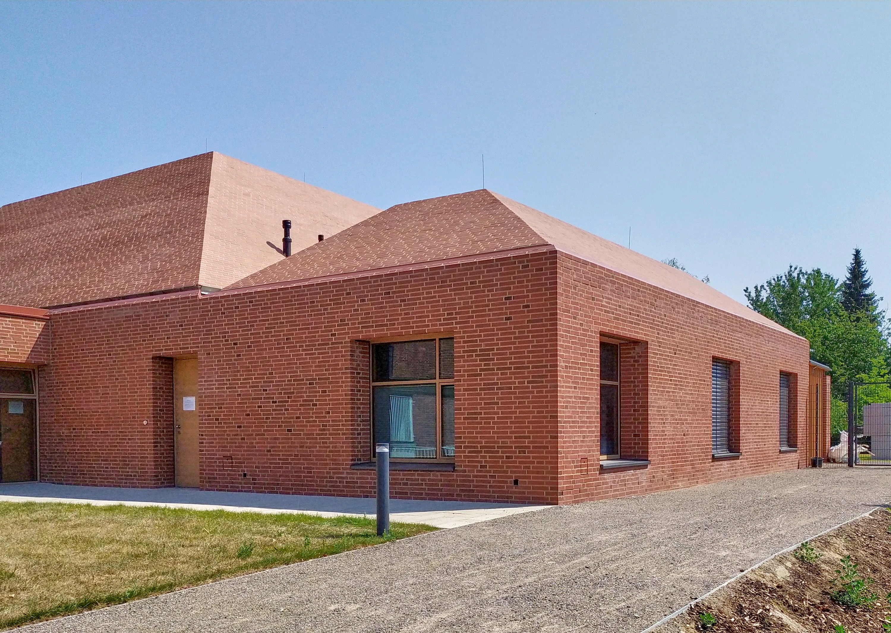 Das markante Merkmal des Gebäudes, das mit Baustoffen unserer Premiummarke tubag gebaut worden ist, ist die Anwendung der gebundenen Bauweise aus dem Garten- und Landschaftsbau auf dem Dach. Anstelle von Dachziegeln wurden Klinkersteine im halben Steinformat verlegt, um sie wie Sparverblender in einem Mörtelbett zu fixieren. Dies verleiht den sieben Gebäuden eine monolithische Ästhetik und eine Verbindung zur angrenzenden Kirche St. Konrad.