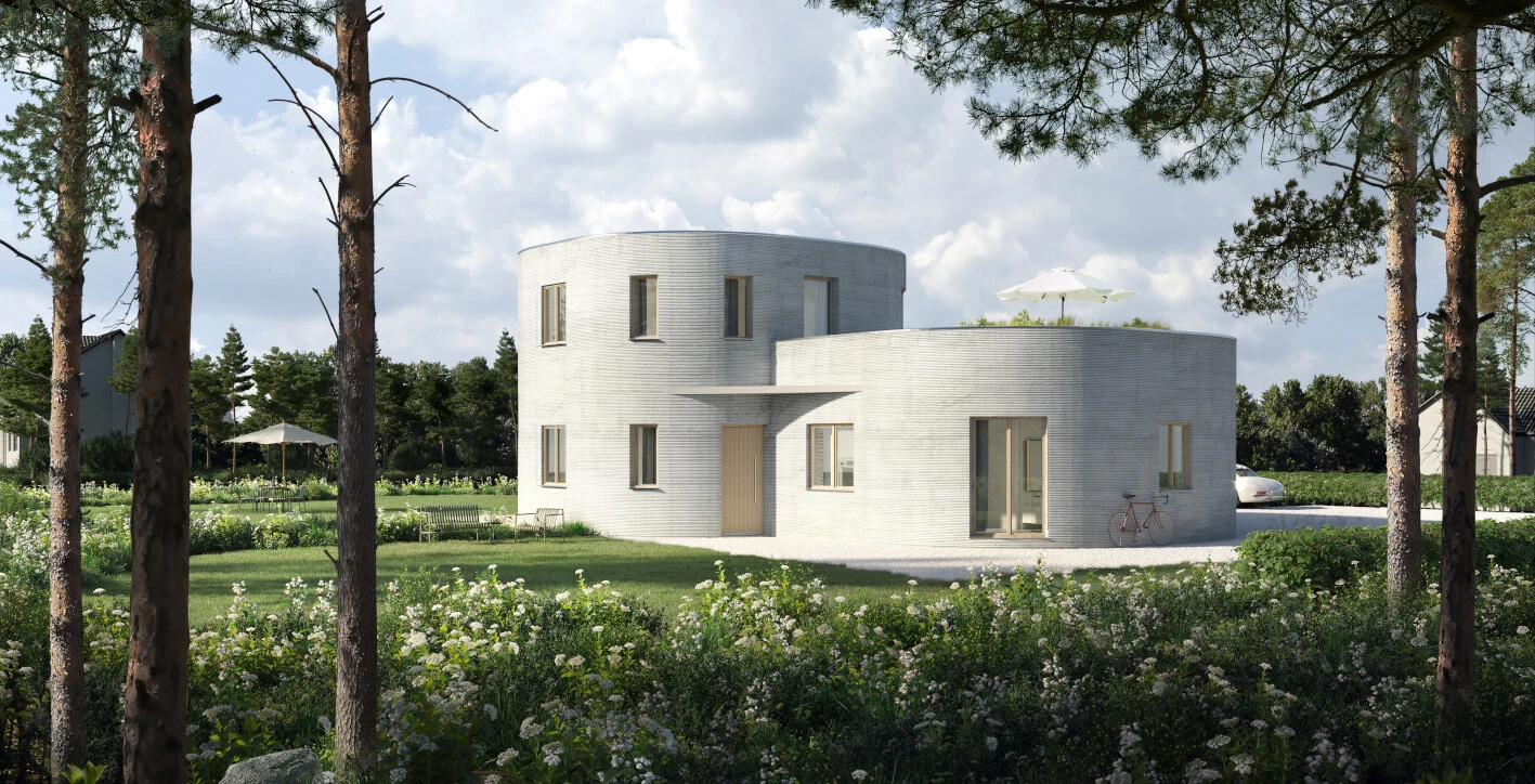 Das nachhaltig gebaute Wohnhaus entstammt dem weltweit ersten Katalog für 3D-gedruckte Häuser „Ready2Print“ und umfasst auf zwei Etagen insgesamt 160 Quadratmeter Wohnfläche. Das Haus namens „Calla“ besteht aus zwei ineinander geschobenen, unterschiedlich hohen Kuben. Der größere, eingeschossige Kubus beinhaltet einen offenen Wohnbereich mit Küche, Ess- und Wohnbereich. Der zweite Kubus ist zweigeschossig mit Schlaf- und Arbeitsbereich sowie Bad. Im Erdgeschoss befinden sich ein großes Schlafzimmer mit Ankleide, ein offener Dusch- und Badebereich in geschwungenen, bedruckten Formen sowie ein separates WC. Vom Obergeschoss gelangt man auf die 21 Quadratmeter große Dachterrasse. Im Inneren bilden Türen und Fenster in warmer Holzoptik einen angenehmen Kontrast zur Betonoberfläche der gedruckten Wände.