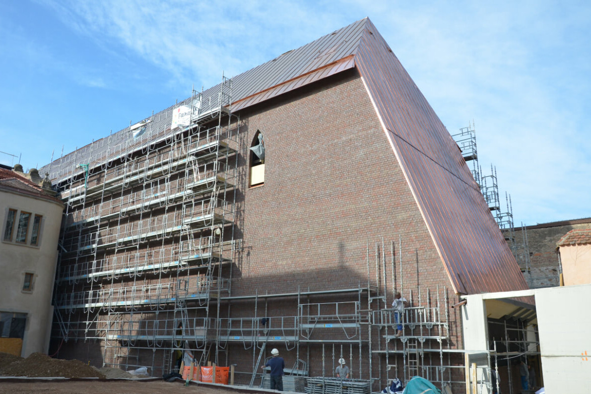 Den Fassadenaufbau des neuen Museumsflügels übernahm das Unternehmen Groupement GFC Scherberich. An der Stahlbetonwand brachten die Handwerker zunächst die Spezialanker an. Diese wurden fest in der Betonwand verschraubt. Auf die Betonwand kam dann eine Hochleistungswärmedämmung, die mit entsprechenden Aussparungen für die Anker versehen werden musste. Zuletzt zogen die Maurer die Ziegelwand hoch. Die Ziegel vermauerten sie dafür vollflächig in der Stoß- und der Lagerfuge. Durch die enorme Höhe der Wandflächen kam es hier auf ein vollkommen senkrechtes Aufmauern der Fläche an. Deshalb legten die Maurer an der planen Rückseite der Ziegel ein Senkblei an und achteten Lage für Lage streng auf das Lot.
