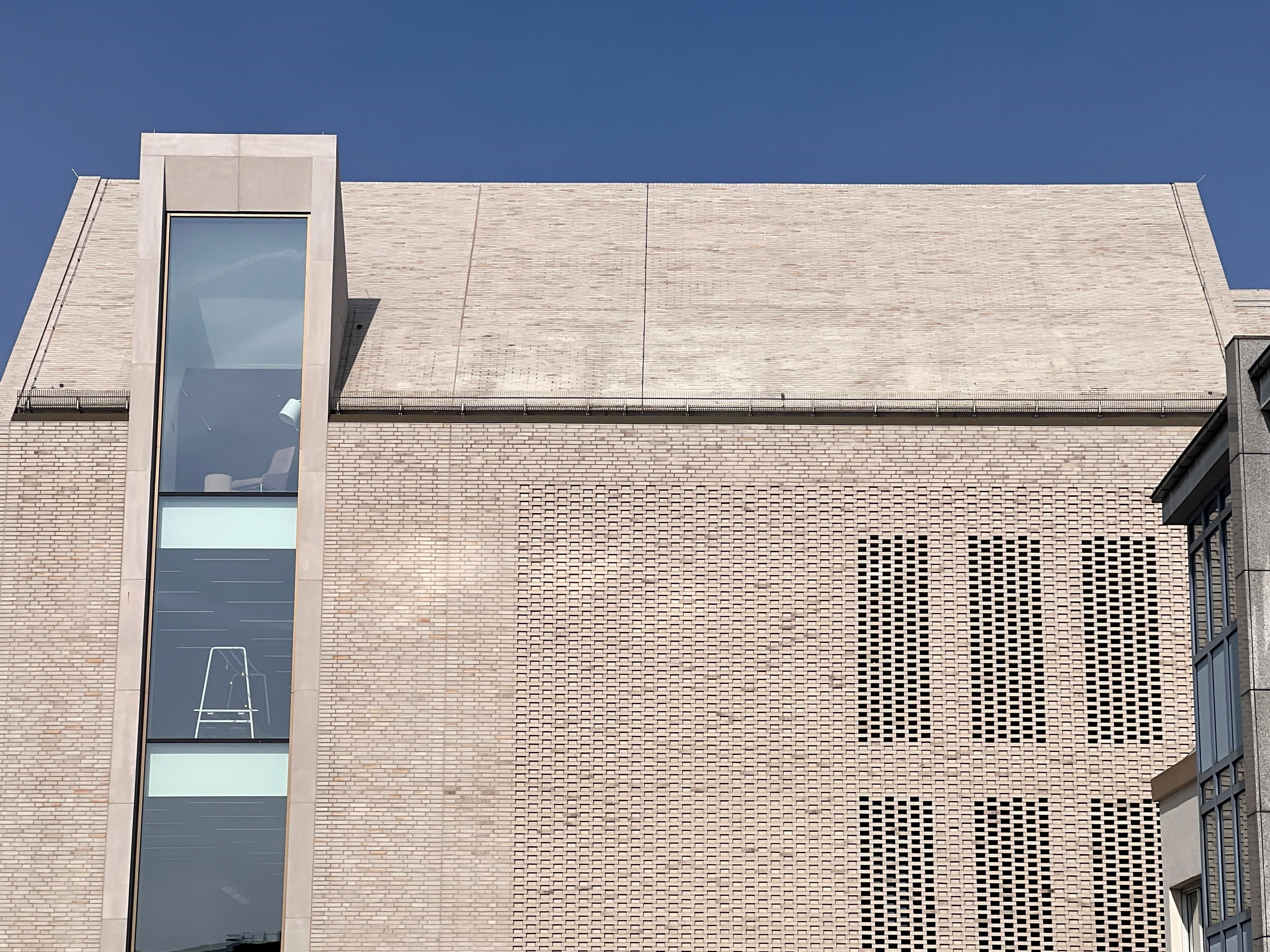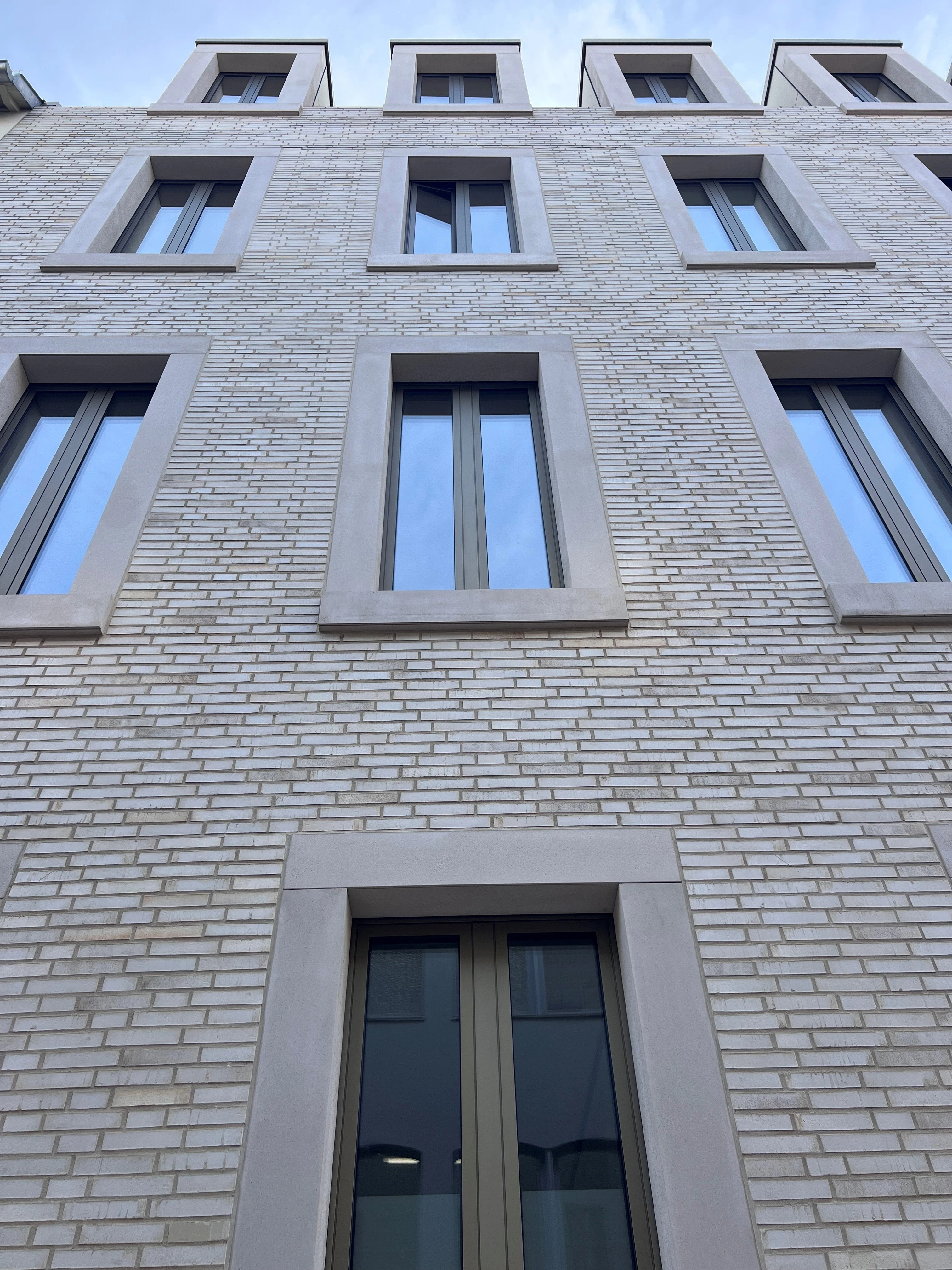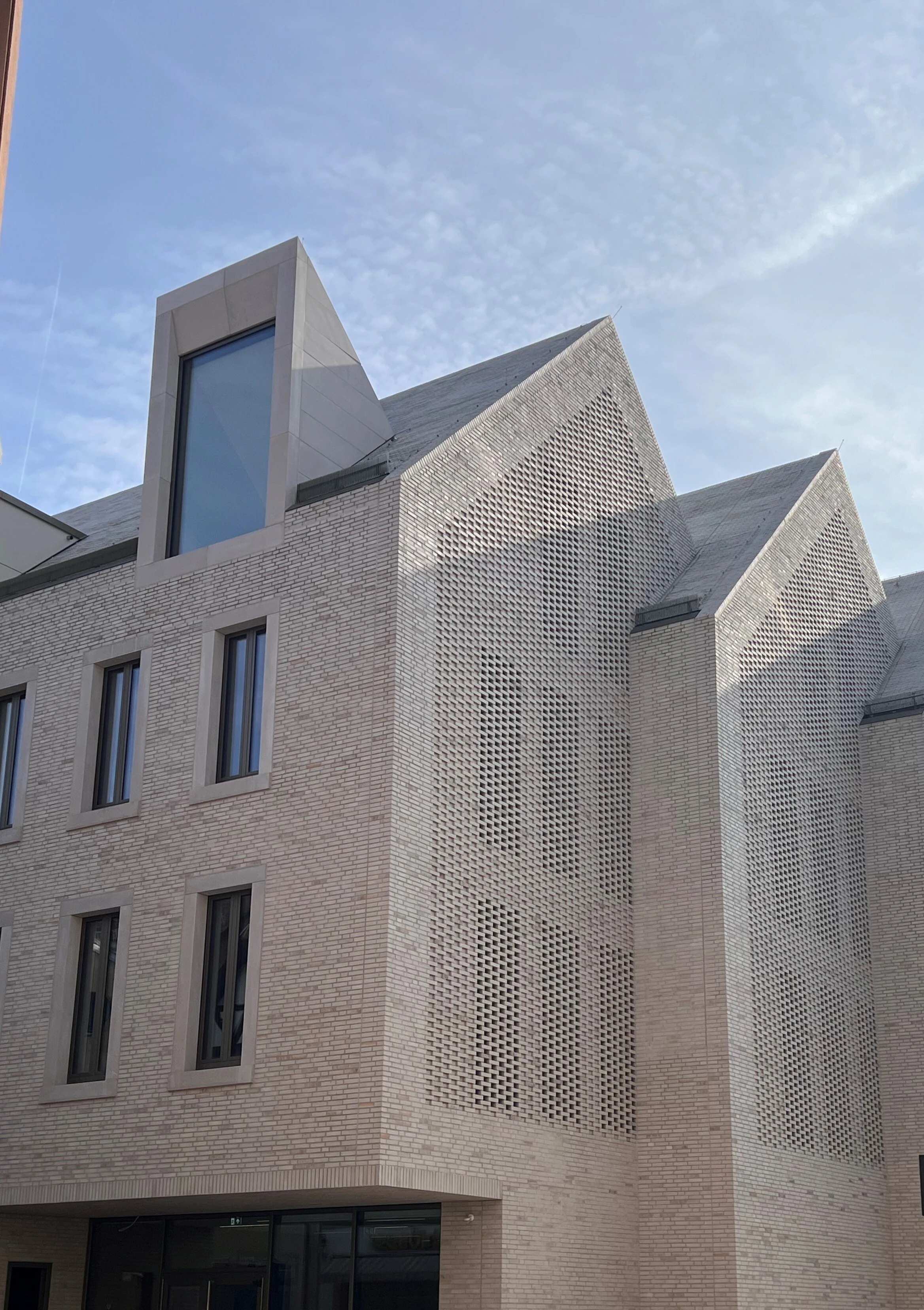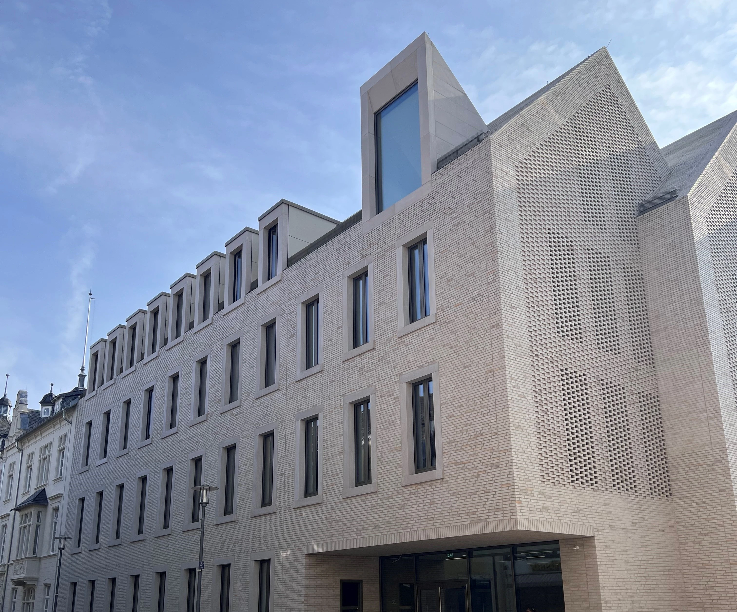 Der neue Kopfbau führt die historische Kubatur des Rathauses fort und entwickelt daraus ein ortstypisches, gleichsam eigenständiges Gebäudevolumen aus drei ineinander verzahnten, zur Gasse giebelständigen Baukörpern. Der helle Ziegel der Fassade bekleidet auch die Dachflächen und stärkt die kubische Wirkung des Neubaus. Das Giebelmauerwerk ist zum Teil perforiert und filtert den Lichteintrag der dahinterliegenden Fenster. Eine besondere Herausforderung stellte die Dachfläche des Gebäudes dar. In enger Zusammenarbeit mit den Planern wurde ein Systemaufbau aus Drainagematte, tubag TDM plus Trass-Drainagemörtel und tubag TWM-S Trass-Werksteinmörtel spezial entwickelt. Im Bereich der Lochfassade wurde quick-mix VZ01 Trass V.O.R. Mauermörtel verarbeitet. Der Rest der Fassade wurde mit tubag TKF Trass-Kalk-Fugenmörtel M5 verfugt. Um den Baukörper möglichst homogen zu gestalten, wurden die unterschiedlichen Mörtel farblich aufeinander abgestimmt.