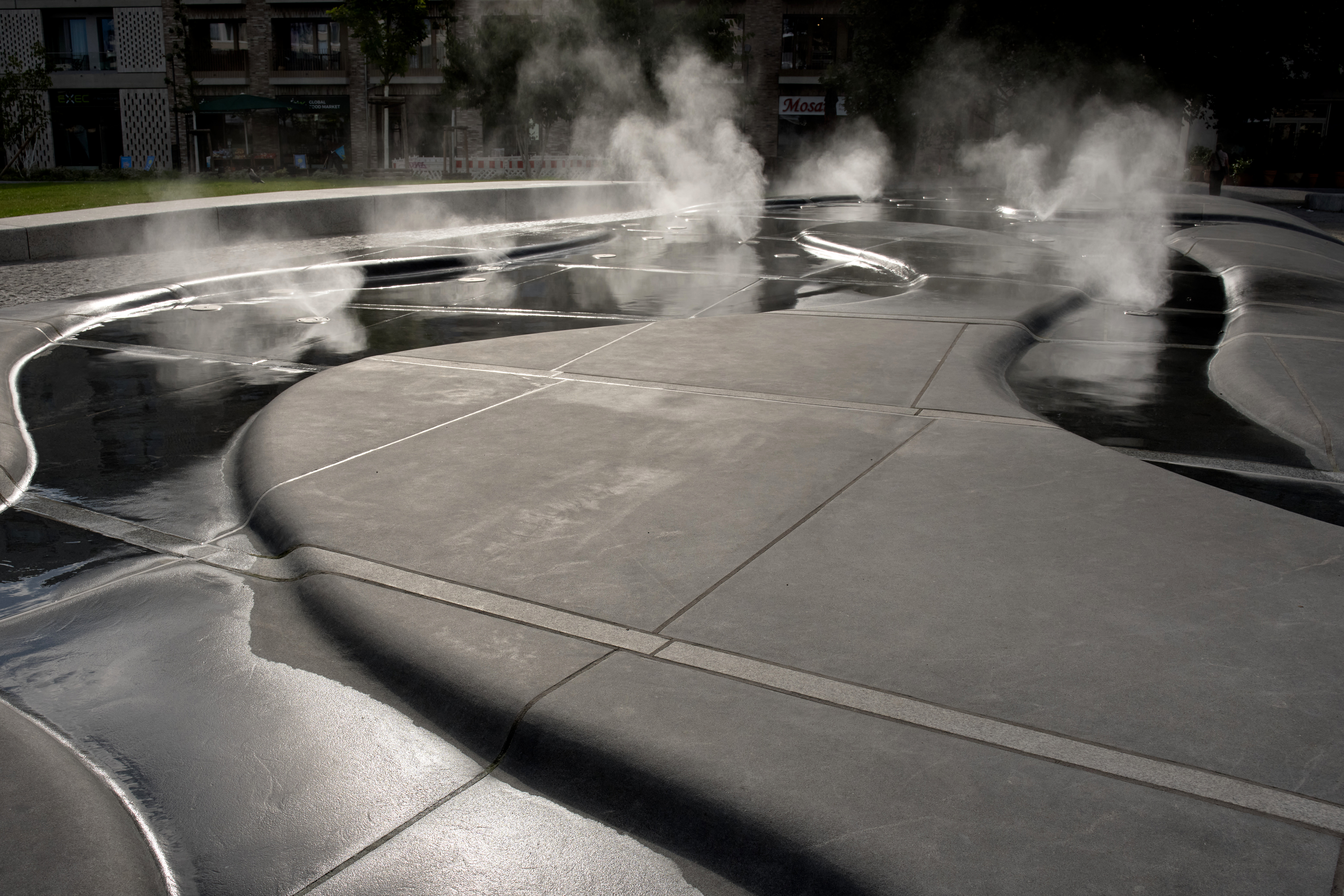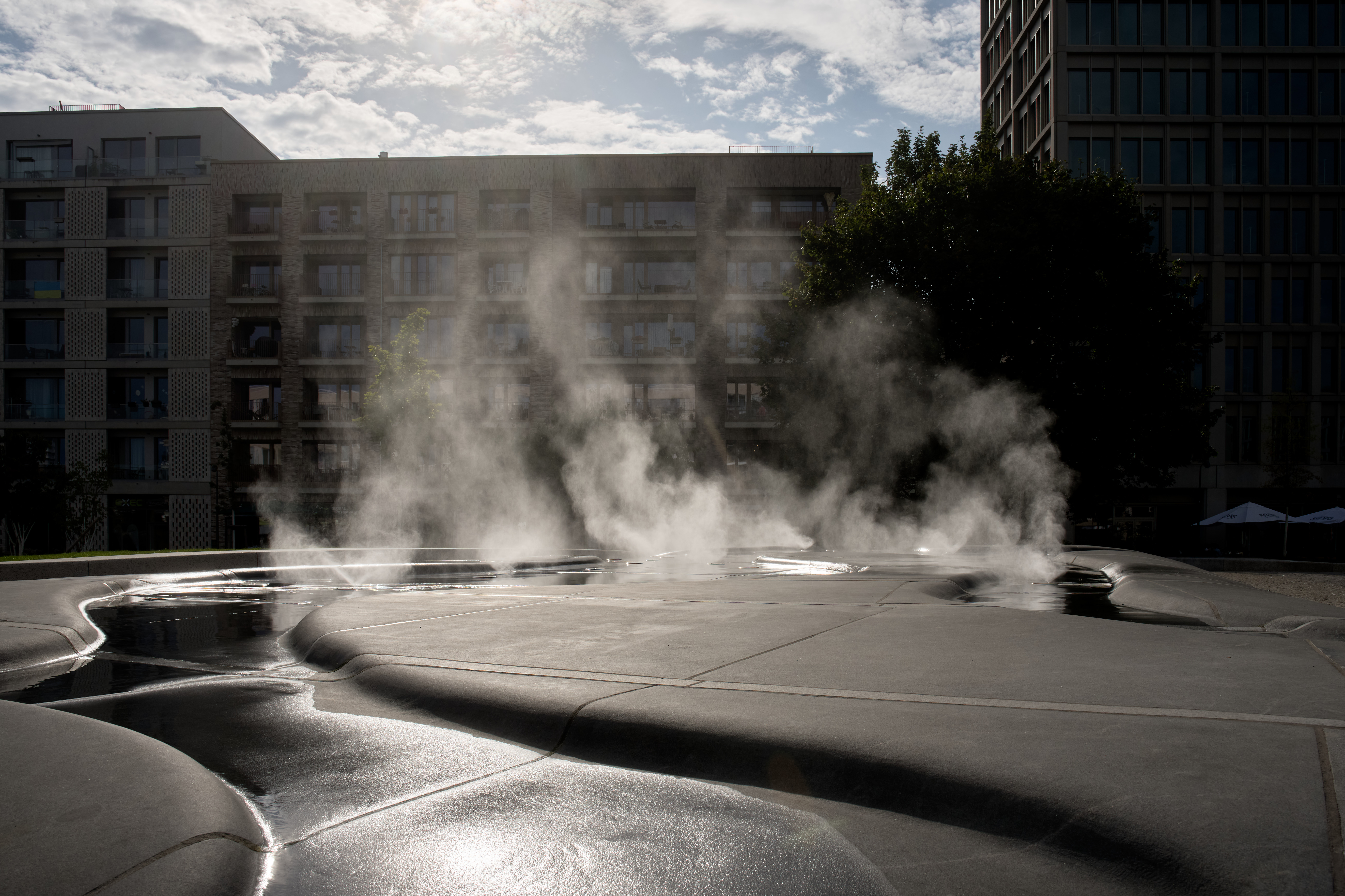 Ein zentrales Highlight dieses neuen Stadtteils ist der Otto-Weidt-Platz, der als öffentlicher Raum eine besondere Aufenthaltsqualität bietet. Im Mittelpunkt des Platzes befindet sich eine beeindruckende Brunnenanlage, deren gestalterisches Herzstück ein massiver Wasserstein aus grauem Granit ist. Dieser wurde nicht nur als optisches Element konzipiert, sondern auch als interaktives Wasserspiel, das durch seine vielfältigen Wasserbilder das steinerne Ambiente belebt und eine dynamische Atmosphäre schafft.