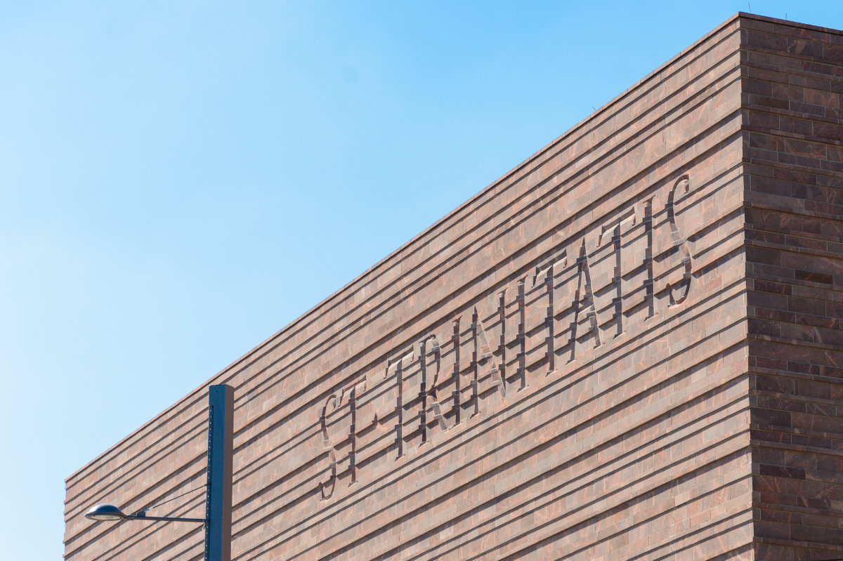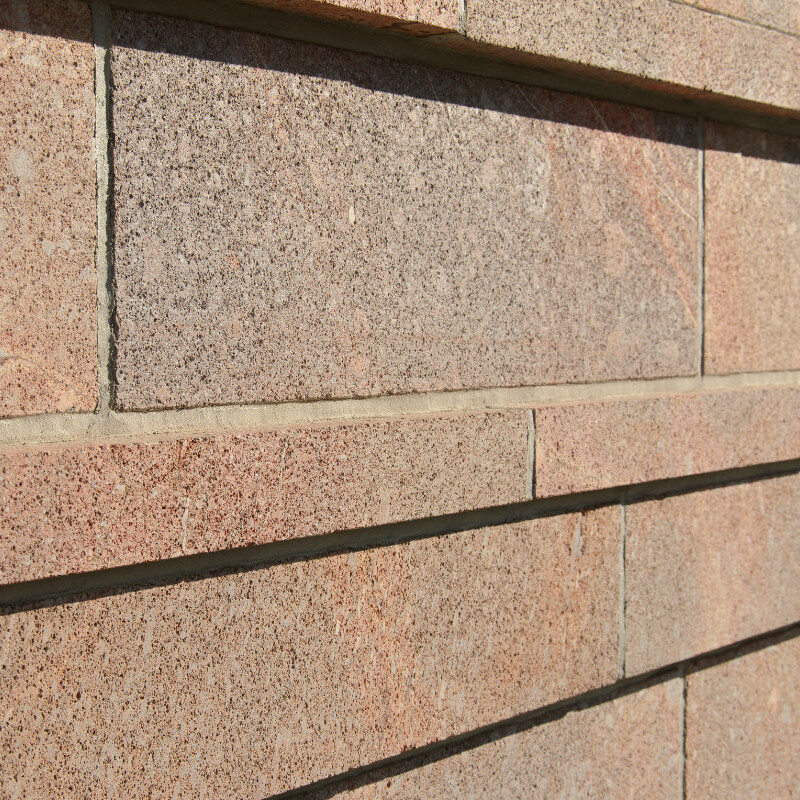 für den Sockel den widerstandsfähigeren Beuchacher Granit einzusetzen, ebenfalls ein Material aus der Region, das allerdings nicht so schnell Feuchtigkeit aufnimmt. Da sich die Arbeiten an der weitflächigen Natursteinfassade vom Herbst bis in den Frühling hinzogen, ergab sich aus den unterschiedlichen Temperaturbedingungen eine Herausforderung. Während der Mörtel bei den kalten Temperaturen zunächst länger offen war, verringerte sich die Abbindedauer mit Ende des Winters. Der Mörtel musste dabei zielgenau angepasst werden, um die Funktion und die einheitliche Optik der Fugen nicht zu gefährden. Vermauert wurden die Steine per Hand und in einem direkt darauffolgenden Arbeitsschritt wurden die Fugen mit einem Fugeisen frisch in frisch verfugt. Hierbei galt es, den Mauermörtel auf der Rückseite der Fassade bündig abzustreifen, um einen freien Lüftungsspalt hinter der Vorhangfassade zu gewährleisten. Dafür wurden Leisten als Auffangebene unterhalb des jeweiligen Arbeitsbereichs mitgeführt, um ein Hineinfallen des Mörtels in den Lüftungsspalt zwischen Dämmung und Porphyr-Fassade zu verhindern.