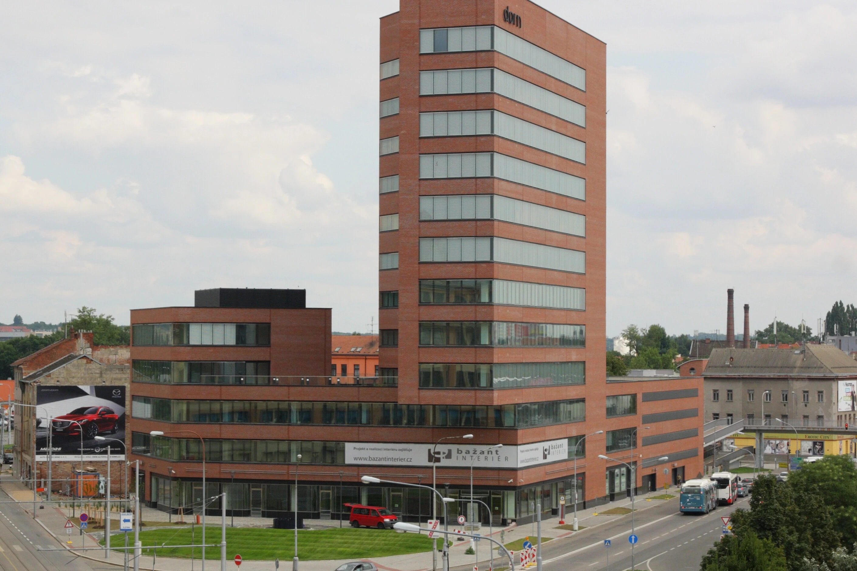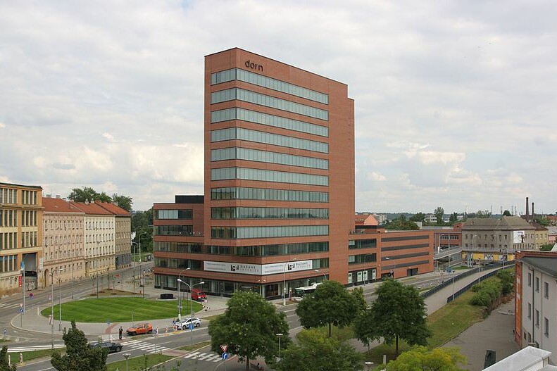 The office building, whose name DORN refers to a historical place name, is located near the historical city centre of Brno. The name . It is a striking modern building with a dominant slender nine-storey tower rising from its three-storey base with an administrative section. On Dornych Street, the building is raised to five storeys. The façade of the entire building is made of facing bricks. Among other things, 276 tons of masonry mortar with quick-mix trass cement were used in the project.