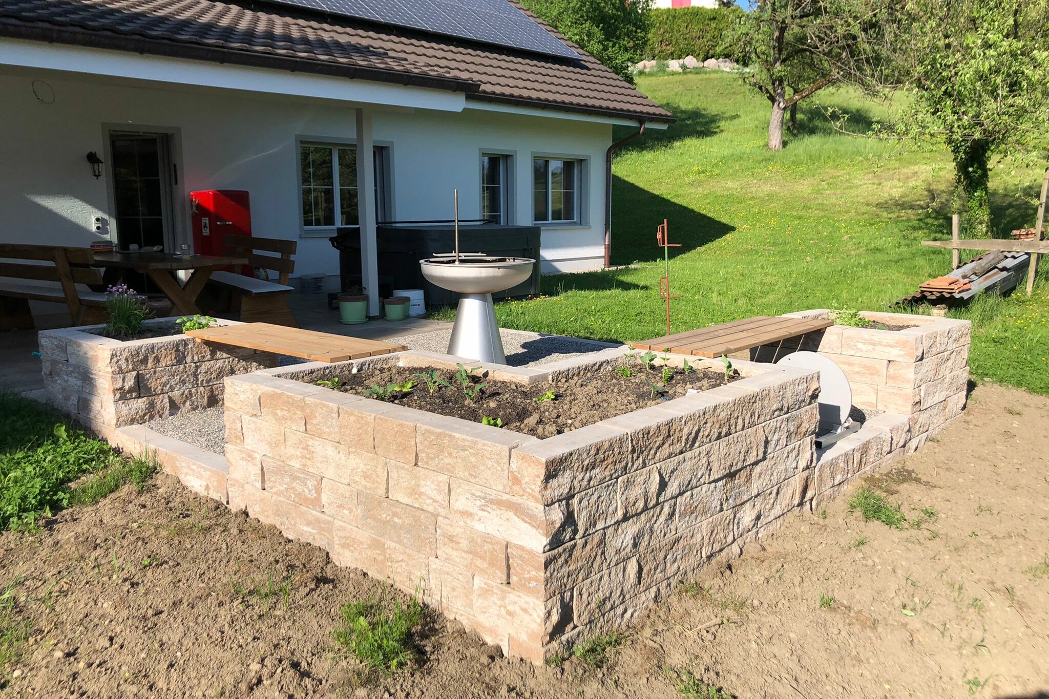 For the seating area edging with raised beds project, three raised beds were created with concrete stones in the colour shell cold. The material used was tubag TZVM and tubag Trass-Kleber Naturstein Dünnbett. As an additional element, the raised beds can be connected with beautiful wooden boards, thus creating further seating areas for guests.