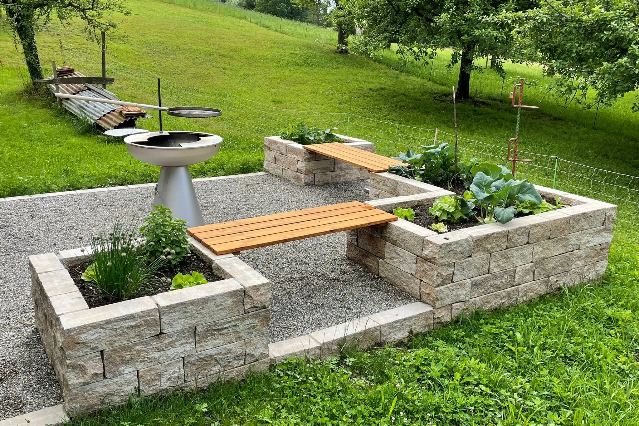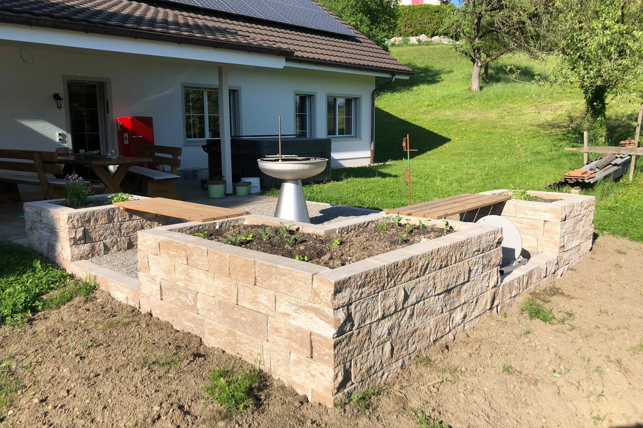Dans le cadre du projet d'aménagement d'une place assise avec des parterres surélevés de Sievert AG en Suisse, trois parterres surélevés ont été réalisés avec des blocs de béton de la couleur Muschelkalt. Les matériaux utilisés sont tubag TZVM et tubag Trass-Kleber Naturstein Dünnbett. Comme élément supplémentaire, il est possible de relier les parterres surélevés avec de belles planches en bois et de créer ainsi d'autres places assises pour les invités.