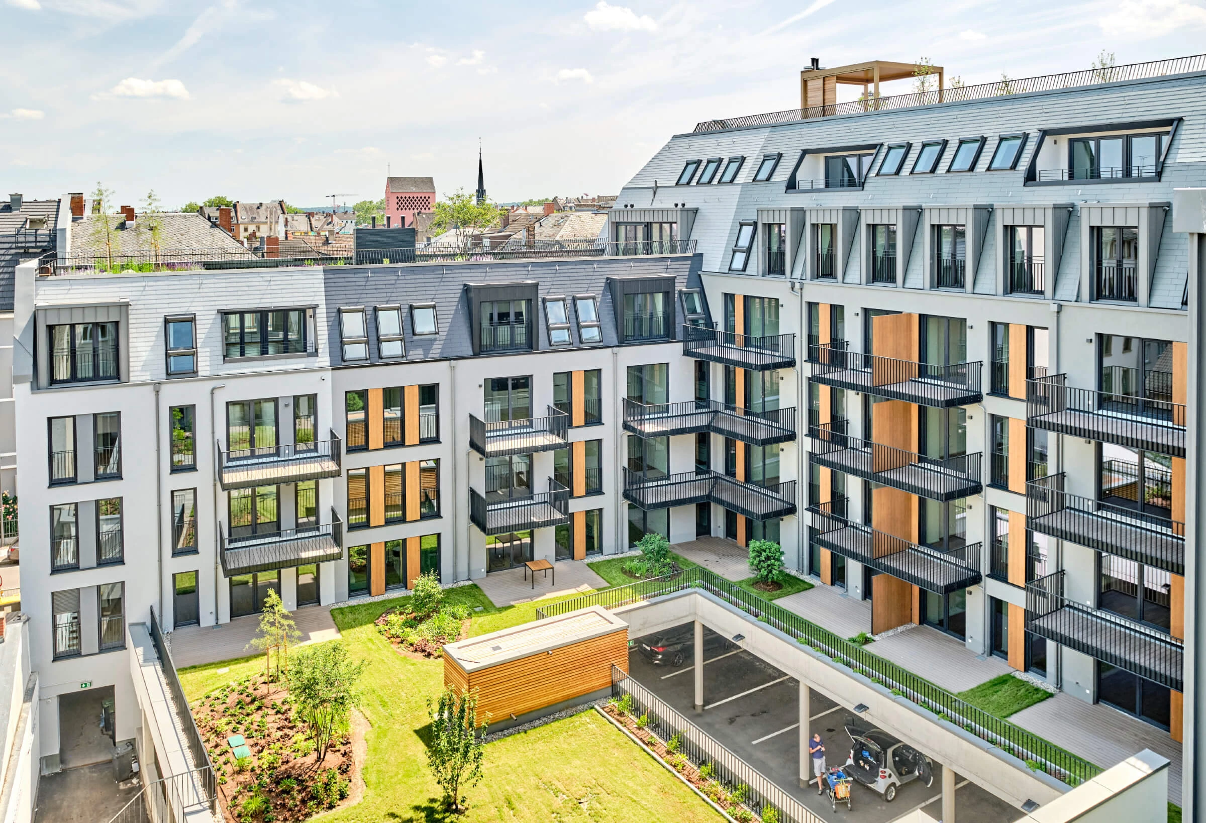 Of liever omhoog, bijvoorbeeld naar het Skyline Deck, een enorm dakterras met een ongelooflijk 360° uitzicht over de indrukwekkende skyline van Frankfurt. Dit deels gerenoveerde, deels nieuwe complex van topkwaliteit met 162 huurappartementen en vier bedrijfsunits aan de Burgstraße heeft gevels die aan de hoogste eisen voldoen. Voor de gevels kozen de architecten voor een subtiele combinatie van baksteenslips en bepleisterde oppervlakken. Zowel hoofdaannemer Jöst Bau (Frankfurt) als gespecialiseerde aannemer Dawid Pogwizd (Weiterstadt bij Darmstadt) vertrouwden op de bouwmaterialen van akurit, het premiummerk voor bepleisterings-, pleister- en isolatiesystemen van Sievert SE uit Osnabrück. Render-, pleister- en isolatiesystemen van akurit werden gebruikt op de gevels, in het interieur en in de keldergarage. In totaal leverde akurit meer dan 6400 m² muur- en vloerisolatie in de vorm van haar Nordic MWP R thermisch isolatiecomposiet systeem en Basis EPS M.