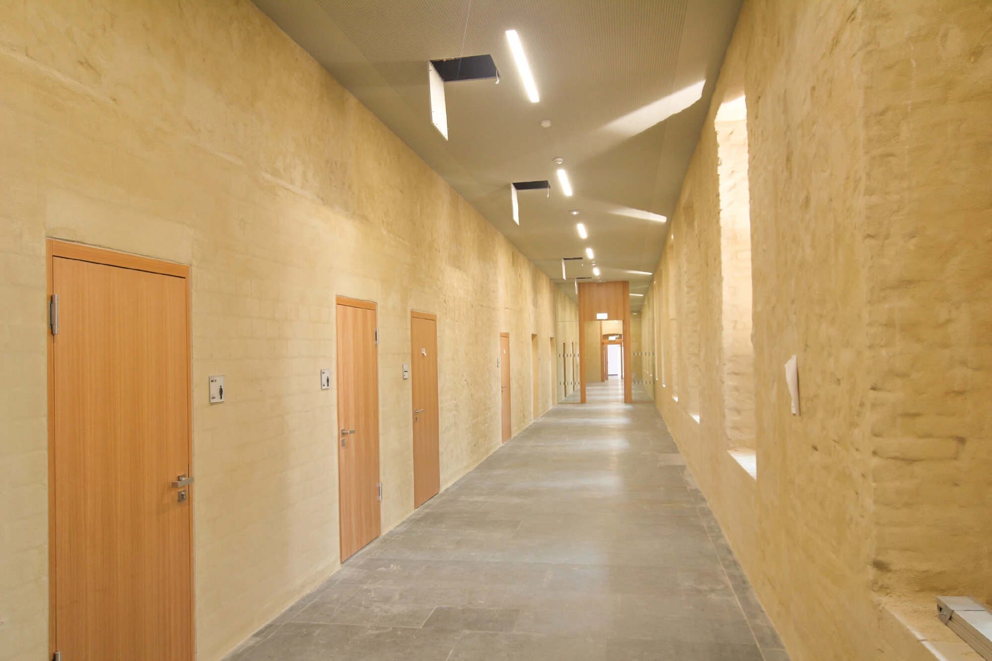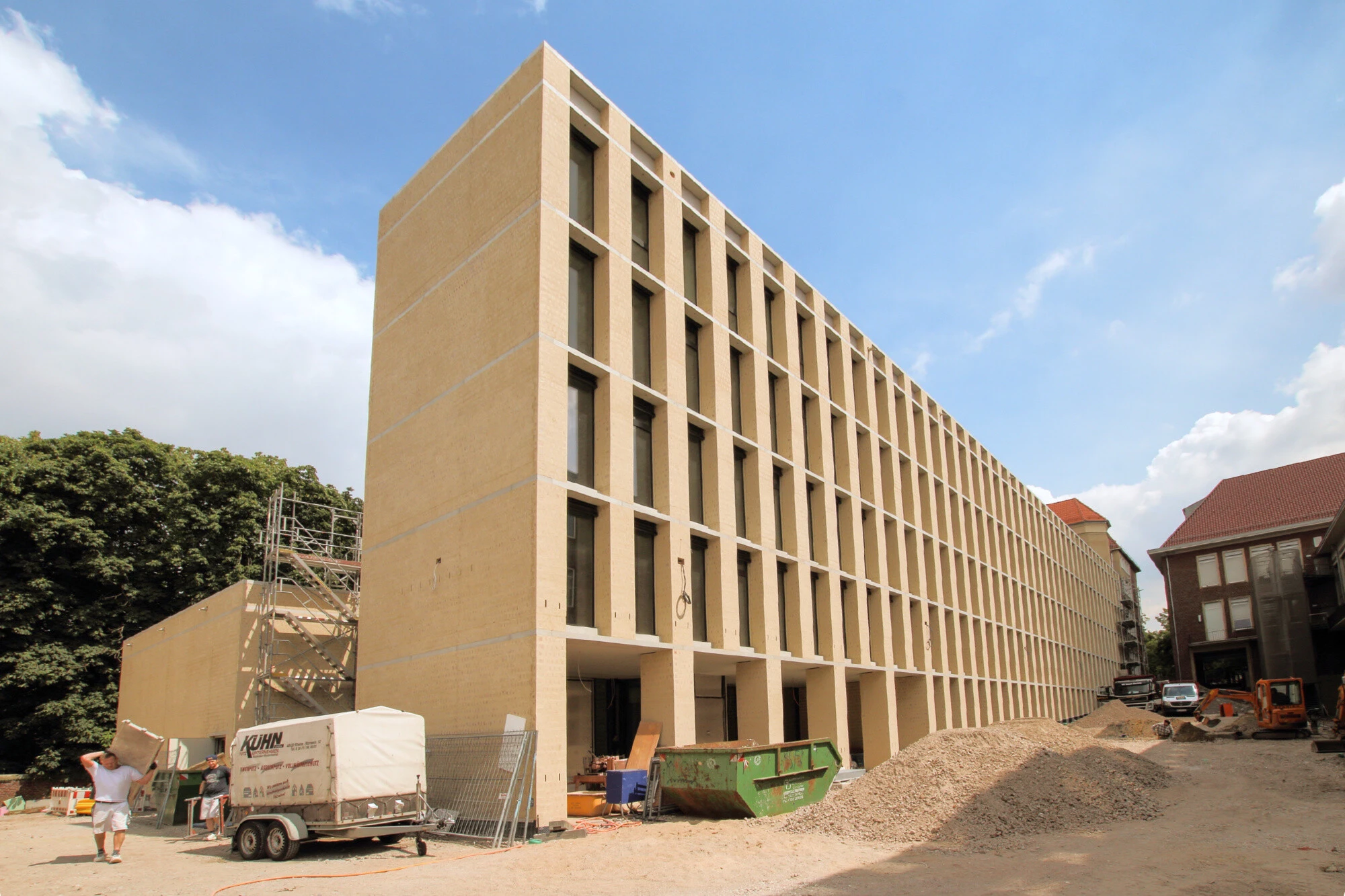 Het ontwerp van de gevel bleek een echte uitdaging te zijn, omdat het van essentieel belang was het historische gebouwenbestand te verbinden met de nieuwbouw en tegelijkertijd het karakter van beide te behouden. quick-mix experts en quick-mix bouwmaterialen speelden een grote rol bij het bereiken van het uiteindelijke, opvallende uiterlijk. De lichte zandkleurige gevel geeft het Philosophikum een onmiskenbaar karakter. Peter Böhm - die in 2010 de architectuurwedstrijd won - had voorgeschreven dat het voor deze regio zo typische baksteenwerk van rode klei moest worden gewit met een mengsel van trassi-kalk plus geselecteerde fijne poeders en korrels. De gevel van het nieuwe gebouw verwijst dan ook naar de omringende structuren, zoals de bisschoppelijke gebouwen in de buurt en het Fürstenberghaus, dat onderdak biedt aan collegezalen van de universiteit. Het Philosophikum is een imposant bouwwerk geworden dat niet misstaat tussen zijn historische buren - integendeel zelfs. Vanuit het midden van het domplein bekeken, biedt het de toeschouwer een interessante architectonische mix.
